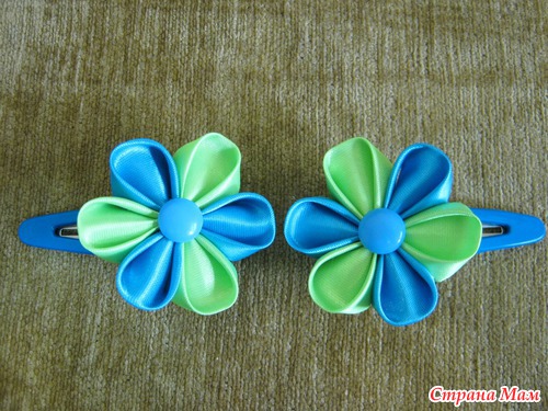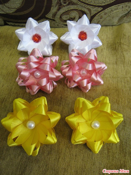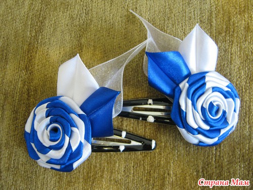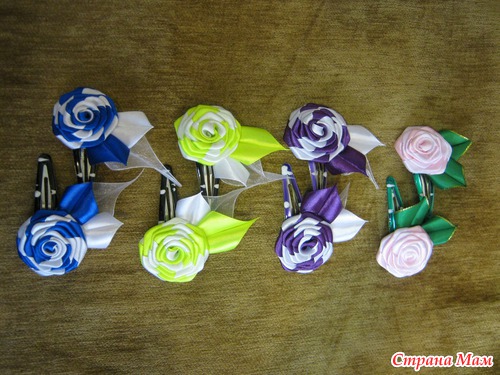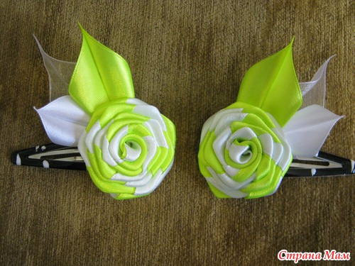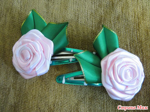 Розочки - это обычные крученые розы , только из 2-х лент . Ленты на резинках использовала атласные .