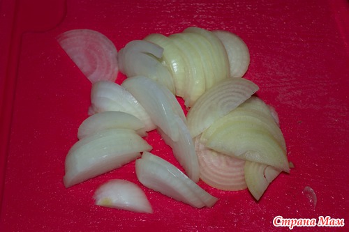 Режем лук и помидоры полукольцами