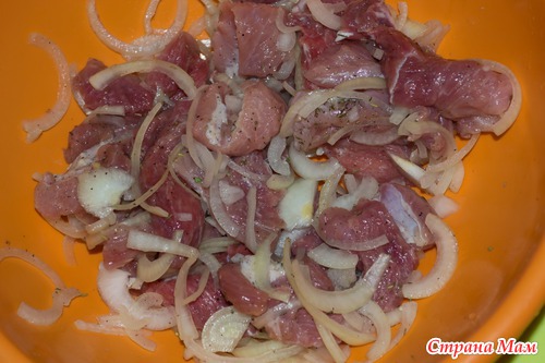 За это время подготавливаем мясо, у меня была свинина, я порезала её на кусочки среднего размера, слегка отбила, посолила, поперчила