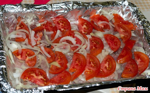 И выкладываем в форму предварительно смазаную оливковым маслом. Сначала слой мяса и лука, затем помидоры