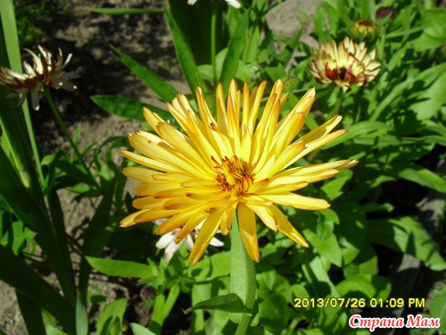 Цветёт это цветок теперь так. А рядом с ним видны цветочки Космеи.