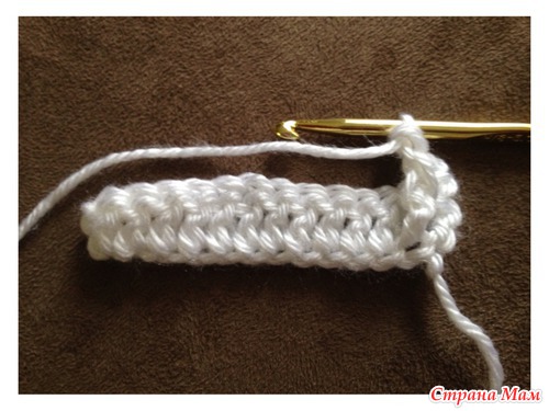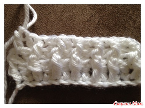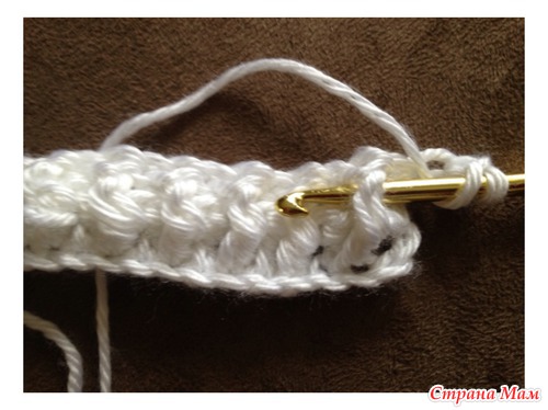 4. Теперь наш узор будет состоять только из столбиков с накидом. Поэтому накидываем нить на крючек.