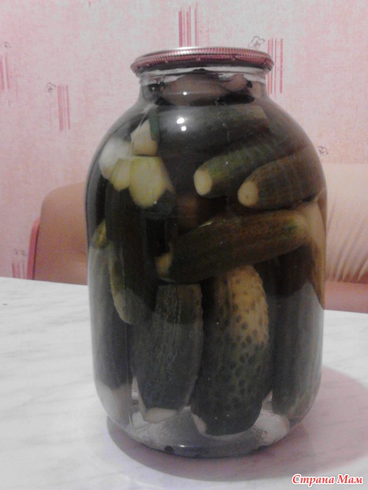 Так-с, воду слили. Кладем в банку зонтик укропа, 5-6 листьев смородины, чеснок исходя из того, какая банка. На 3-х литровую беру 3 зубчика и т. д. Заливаем маринадом. Закатываем крышкой. Переворачиваем.