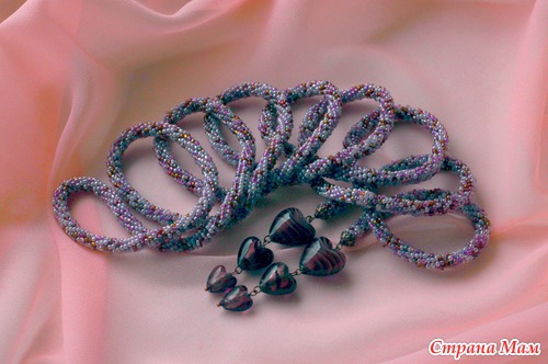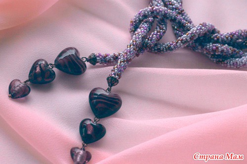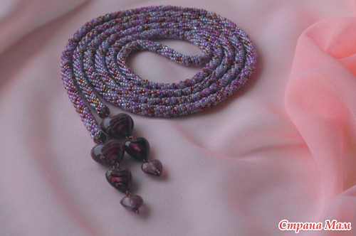 Лариат связан крючком из полиэстровой нити с использованием бисера разных оттенков: бледно-розового, светло-сиреневого, немного коричневого с радужным покрытием. Бусины-сердечки ручной работы.