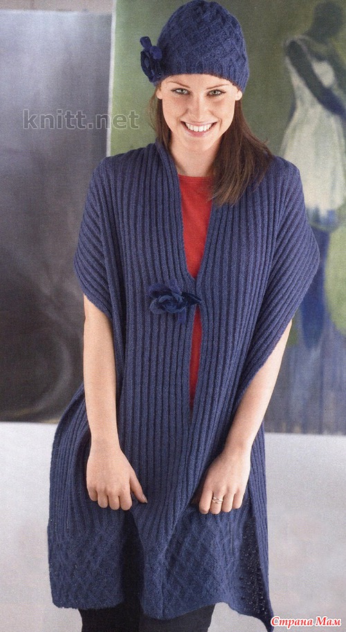 Красивая и необходимая в любую пору года накидка и шапочка, украшенные цветком, связаны спицами из тёмно-синей пряжи Mondial Gap. Цветок связан также спицами. Плавные линии длинной накидки делают фигуру стройнее, а вязаные цветы очень оживляют весь ансамбль.