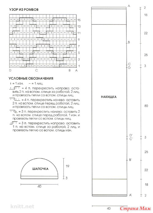 Резинка 2х2: попеременно 2 лиц., 2 изн. Узор из ромбов: вязать по схеме. В изн. р. петли вязать по рисунку. Начинать с петель перед раппортом (участок АВ), повторять петли раппорта (участок ВС), заканчивать петлями после раппорта (участок CD). Повторять с 1-го по 16-й р.