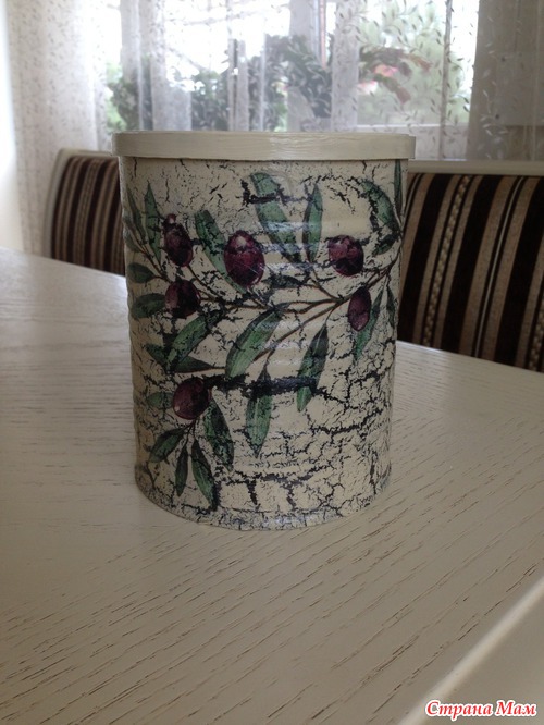 Была у меня жестяная баночка из- под детского питания, и вот она дождалась своего окультуривания так как все заготовки закончились))) потянуло меня на кракле и оливки. А что из этого вышло судить вам!