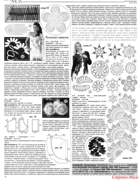 Чтобы связать это короткое свадебное платье (размер 42-44), вам потребуется: разнообразная по составу и толщине пряжа: 500 г хлопка с люрексом (95% хлопка, 5% метанита, 325м х 100г.), по 100 г. хлопка с вискозой (35 % хлопок, 65 % вискоза, 200 м х 50 г) и вискозы с серебряным люрексом (400 м х 90 г), 25 г серебряного люрекса, немного “Травки” для декора отдельных мотивов; крючки разной толщины в зависимости от используемой пряжи; “вилка”, бусы под “жемчуг”, атласная тесьма с петельками-фестонами; тонкая гибкая проволока.