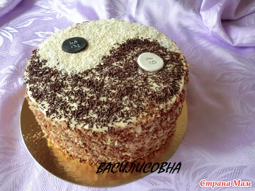 внутри бисквит на чёрном и белом шоколаде, крем сливки+варенка+масло, кусочки обжаренного миндаля