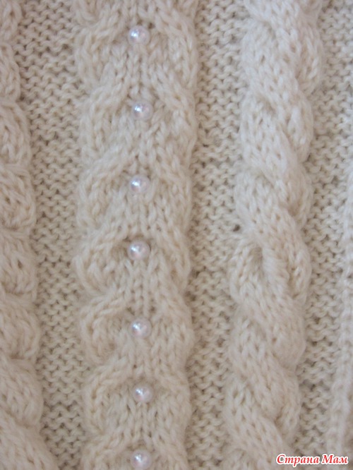 Ниточки выбрала шерсть, название точно не помню., что не суть важно. Рисунок из двух аранов или кос, как у нас говорят. Центральный аран, решила усовершенствовать украсить бусинами.