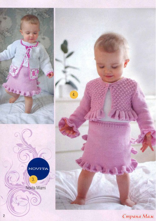 Здесь два варианта жакетика, крючком и спицами, юбочка спицами. Модель вроде не сложная, так что подойдет даже для начинающих.