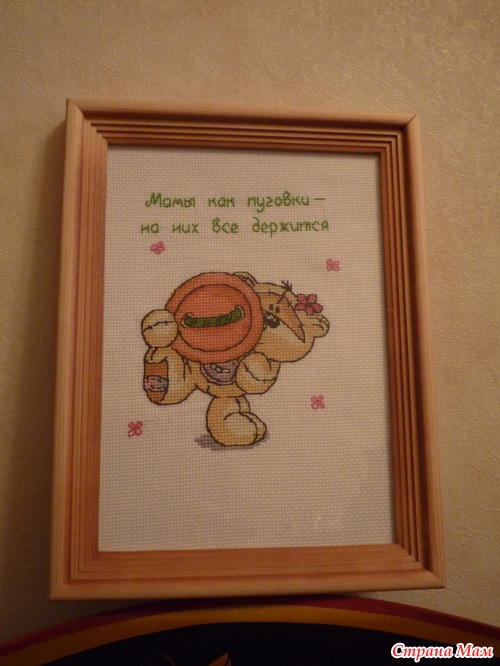 Вышивала по схеме, присланной Савельевой Дарьей, за что ей большое спасибо!!! Нитки гамма, подбирала из запасов, немного поменяла цвета и получила такого забавного медведя. А рамку нашла в своих хомячьих запасах.