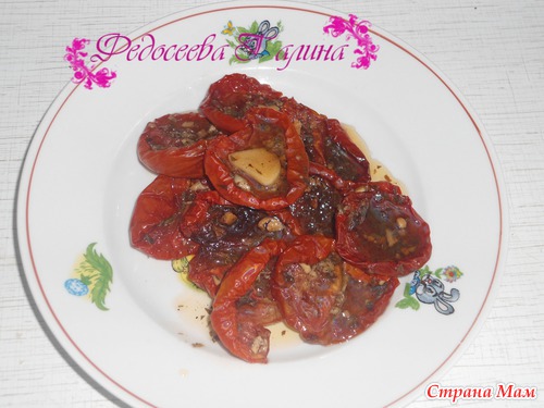 помидоры разрезать пополам очистить от косточек. выложить на противень. размять чеснок с травами и перцем с добавлением кукурузного масла(не много). посыпать каждый помидор солью смазать получившейся смесью. нарезать ещё чеснок пластинками и выложить по пластинке на каждый помидор. можно немного сбрызнуть маслом. вялить в духовке при 100 градусах 3-3.5 часа. простерилизовать банку у меня была 700 граммовая. выложить помидоры слоями в банку залить маслом. убрать в холодильник.