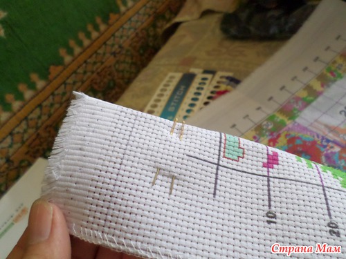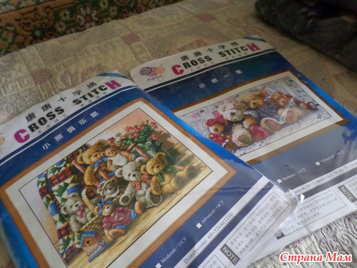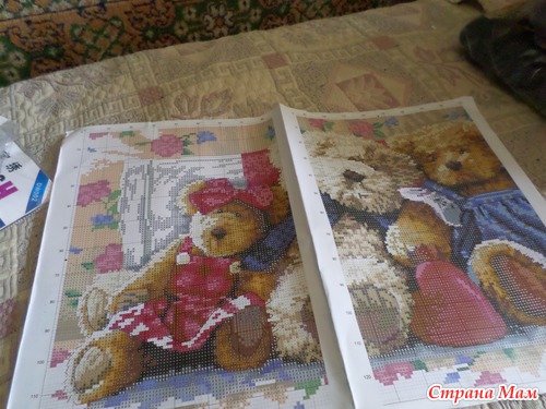 а вот это -канва... Я что то поздно допетрила, что её можно поменять на меньшую. Порадовали оверложенные края, совсем не радует нанесенная схема. И даже настораживает этот зеленый мишка.