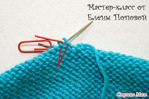 вяжем по изнаночной стороне до красной скрепочки. Здесь также провяжем вместе 2 петли. Одну справа от скрепки, а вторую слева. Скрепки вынимаем. Они нам больше не нужны. Вязание поворачиваем на лицевую сторону.