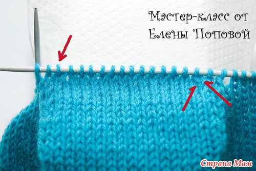 Осталось оформить нижний край шапочки: вязание у нас закончилось на изнаночной стороне (стрелочкой показано, где оставалась ниточка). Этой ниткой из каждой краевой петли боковинки вывяжем по 1-й изнаночной петле.
