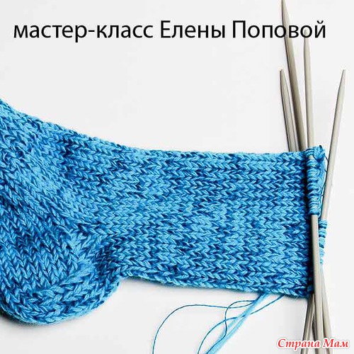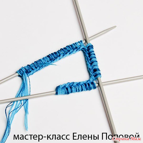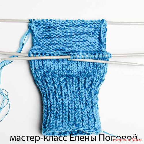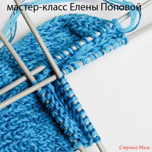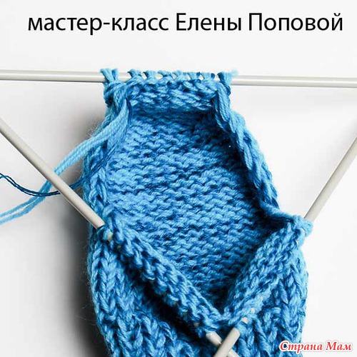 Для формировании пятки связать на 2-х спицах в прямом и обратном направлении на высоту, равную ширине, которую занимают 10 петель на одной спице.