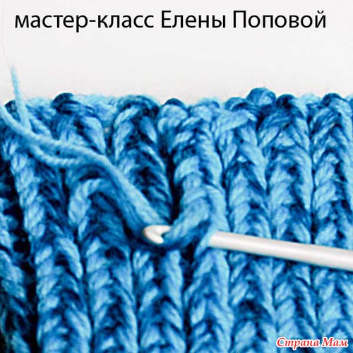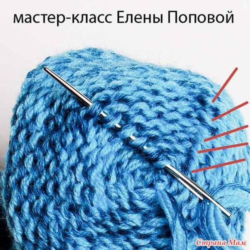 заправить ее в иглу, собрать на нее открытые петли и вывести иголку на изнаночную сторону.