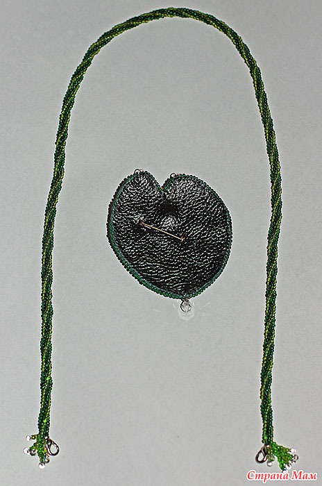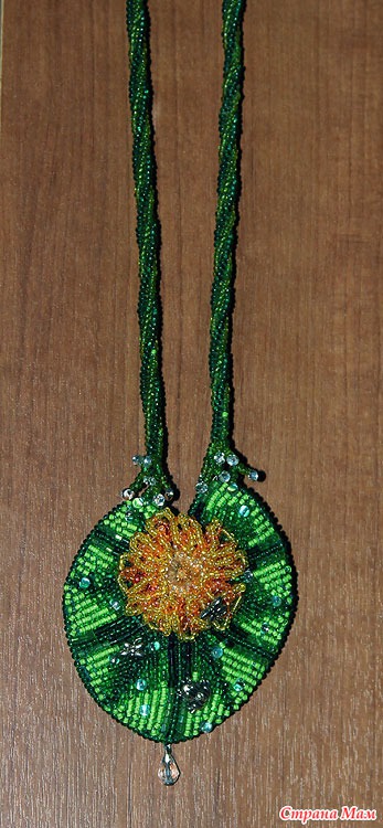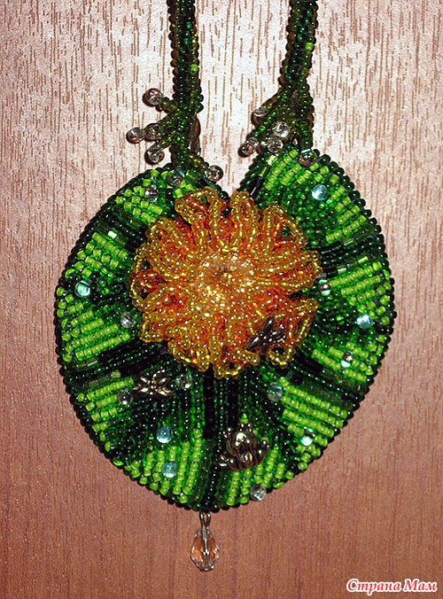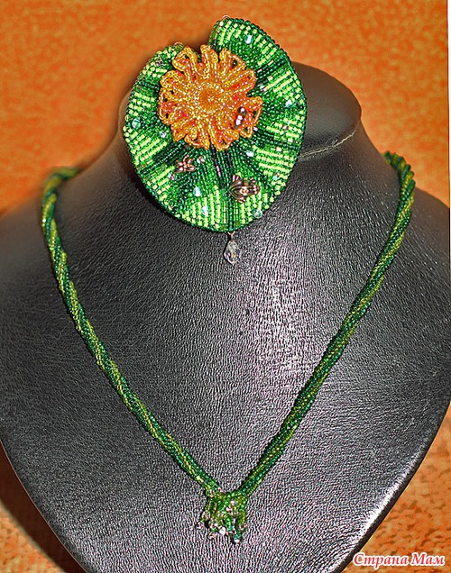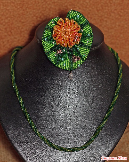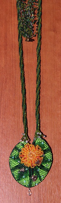 в центре цветка риволи Сваровски, использован чешский бисер и японский Тохо и Миюки дропсы(капли), так же металлическая фурнитура: стрекозки и лягушка...