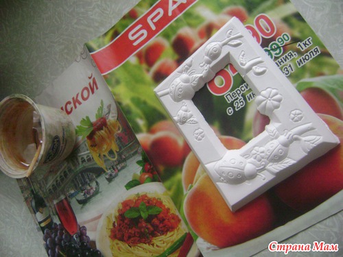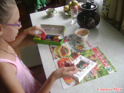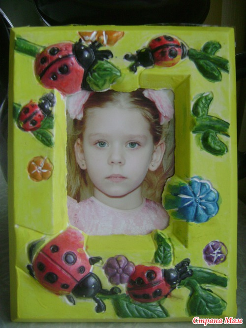 А это уже Лизина работа для конкурса. Фоторамка из гипса. Сначала мы хотели выставить на конкурс вышитую пчелку, но Лиза не успела ее вышить (покажу в след. раз)