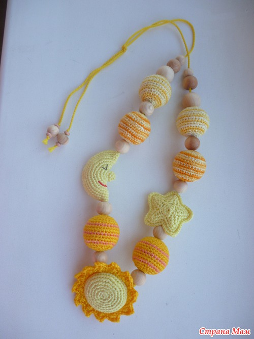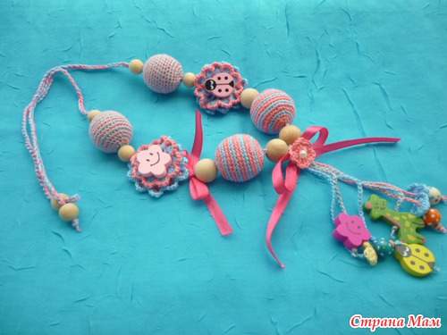 Связала- таки слингобусики, слингоигрушку и бусики для девочки. Везде использованы можжевеловые бусины, нитки Ирис, в последних еще деревянные крашеные бусины. Хвастаюсь!!!