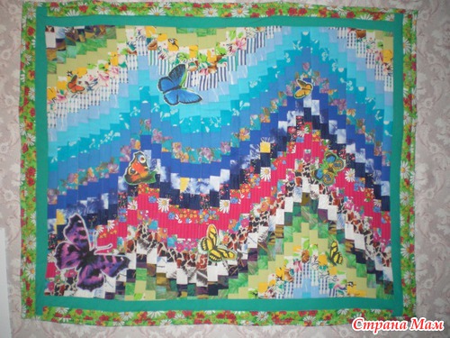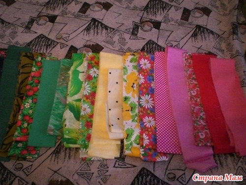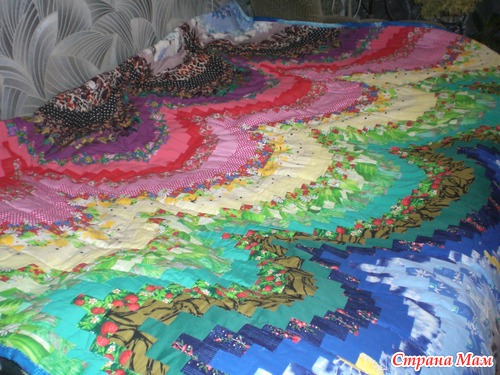 Для этого одеяла потребовалось 32 цвета ткани, в переходящих тонах подбирала как могла, в специализированные магазины не ходила, подбирала из своих залежей. Полосы шириной 8 см., а длиной как нужно покрывало ( у меня 2,5)