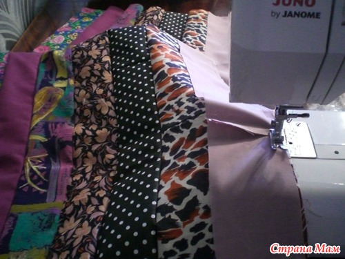 Сшивала полоски по всей длине в рукав, а потом разрезала по диагонали, сдвигала рисунок и снова стачивала.