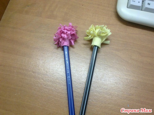 Потом сделала одуванчики на ручки, а то офисные ручки такие скучные, делала тоже из подручных материалов, а точнее салфеток для рук