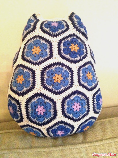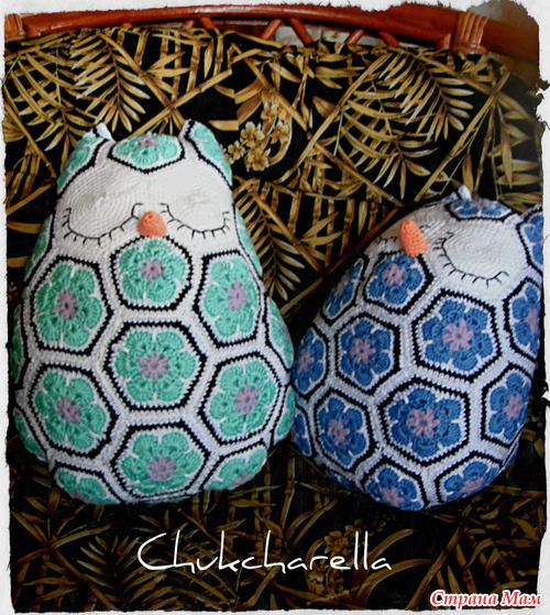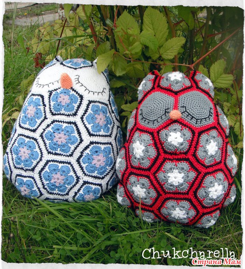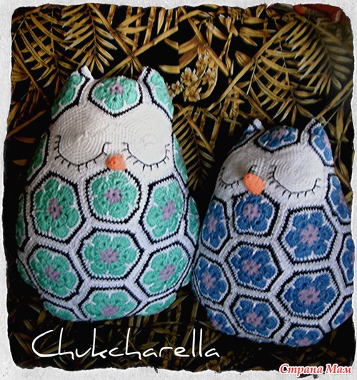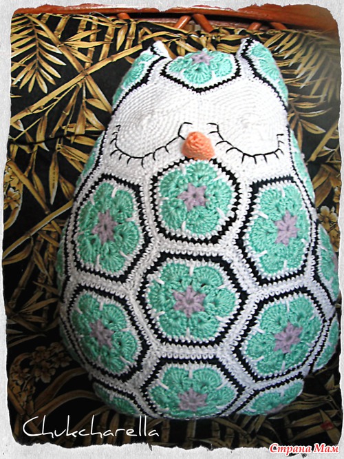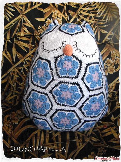 Вот что она пишет насчет мотивов "Посчитала на своей сове, получилось 10 пятиугольников, 17 шестиугольников и 2 шестиугольника на глаза. " (где находятся пятиугольники - Пятиугольник над глазами (лоб), снизу глаз (где клювик), между ушами сзади, и 7 штук бок-низ-бок.) "