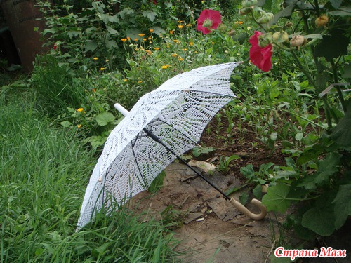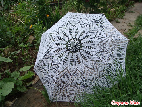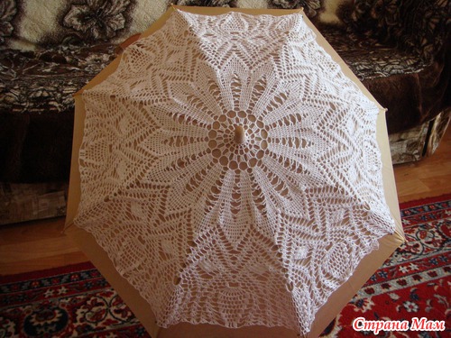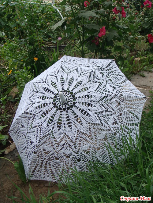 Три года назад увидела в инете фото вязаного зонтика и влюбилась. Очень хотела и я связать, но боялась- не осилю. Но как говорят "глаза боятся, а руки делают".