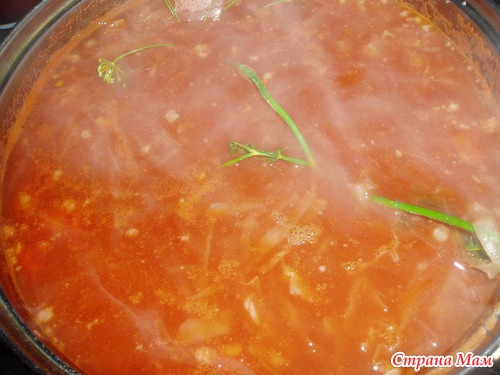 Когда уже борщ готов, газ выключен, запихнуть в кастрюлю с борщом зонтик вместе с стеблем( стебель немного оставить на бортике кастрюли и придавить крышкой), оставить на 20 - 30 мин. Ароматный борщ обеспечен.