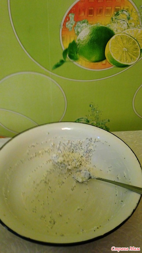 )Для начинки смешала 4 пачки 200-граммовых творога с сырым яйцом, кунжутом, ванилином, маком и чутком