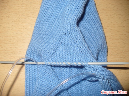 Вяжем по кругу первый ряд все петли лицевыми. Во втором ряду начинаем убавлять прибавленные петли таким образом - 2 петли вместе лиц. (одна петля из числа штанинки, вторая из набранных), провязываем лиц. набранные петли, кроме последней, ее вместе с петлей из штанинки провязать лиц.