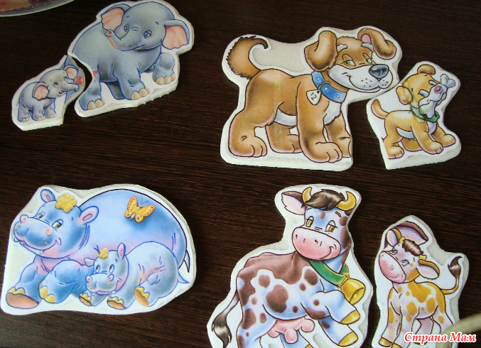 Решила я как то выучить со своим сыночком детенышей животных, но к карточкам он равнодушен, поэтому включила фантазию, чтобы хоть как то его заинтересовать. Скачала с инета картинки животных, обклеила скотчем, разрезала произвольно (вообще-то это картинки пазлов, которые выложены в свободном доступе на сайте castorland) и наклеила на гладкую (ламинированную) белую потолочную плитку.