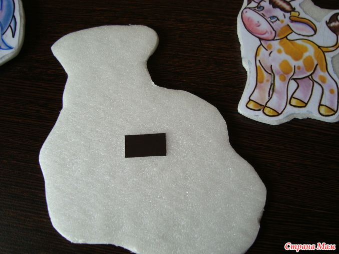 К слову сказать материал этот очень легкий, приятный на ощупь и придает картинкам объем, благодаря чему вертеть в руках такие пазлы ребенку очень удобно. Плитку покупала в ближайшем хозяйственном магазине ( с товарами для ремонта), по цене более чем приемлемой 40 руб. за 1 кв. м. Сзади наклеила небольшие кусочки 1 см x 0,5 см магнитной ленты, а на мелкие детали можно магнитики и поменьше - плитка очень легкая и все прекрасно держится на холодильнике. Ленту, к сожалению, в канцелярских магазинах не нашла, поэтому покупала здесь
