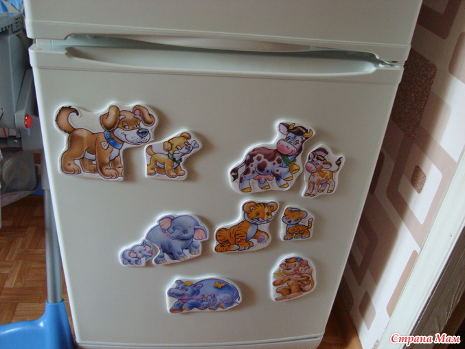 Я магнитики клеила на магазинские мягкие пазлы (у нас с героями Маши), но сынулю они особо не увлекают, сначала мы их пытались собирать на магнитной доске, а сейчас они тоже перекочевали на холодильник, пока там красуются...