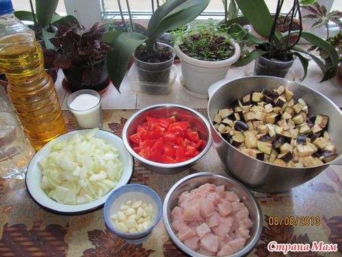 Филе и лук обжарить отдельно по 30 мин. Баклажаны посолить на 30мин