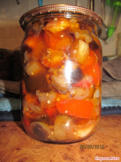 Всё вместе смешать и накидывать в банки. Попробуйте на свой вкус -может надо досолить.(хотя те кто закрывал -говорили что хватает той соли, что солили баклажан) Стерелизовать 30мин