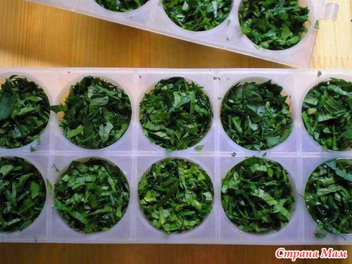 1. Измельчённые травы укладывают в ёмкости для заморозки льда.