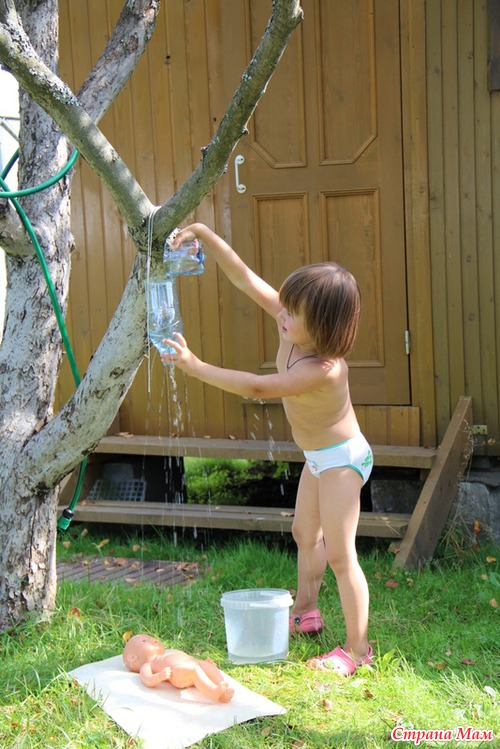 Жара, сказала бы я, но... Мы то на даче. Можно укрыться в тенечке яблони, легкий ветерок приятно обдувает и воды полный колодец. Уж каких только способов охладиться не придумалось. И бассейны, и озера, и поливания из водяных пистолетов, и просто плескание в тазике. Вот еще по-быстрому сообразила душ для Сашки.