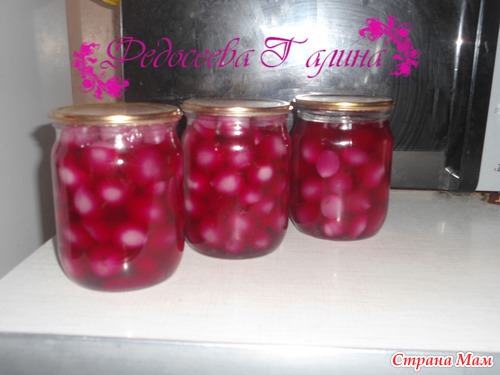 На дно простерилизованных баночек положить веточку тимьяна, лавровый лист, кусочки свеклы, луковички. Залить все удовольствие маринадом.