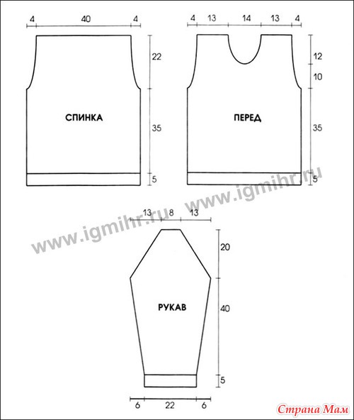 Сборка. Выполнить один плечевой шов. На спицы № 3,5 набрать по горловине 131 п., связать 3 р. резинкой 1х1 и 4 р. двойной резинкой и закрыть все петли трикотажным швом. Выполнить второй плечевой шов и шов планки горловины. Вшить рукава, выполнить швы рукавов и боковые швы.