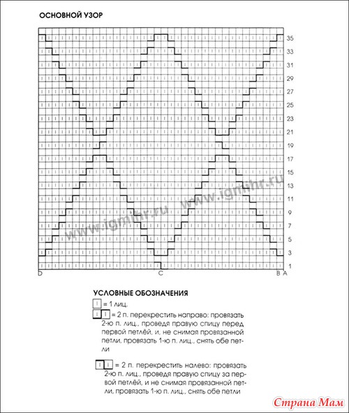 Основной узор: число петель кратно 18. Вязать по схеме. В изн. рядах петли вязать изн. Начинать с петли перед раппортом (А), повторять петли раппорта (от В до С), заканчивать петлями после раппорта (от С до D). Повторять с 1-го по 36-й р.