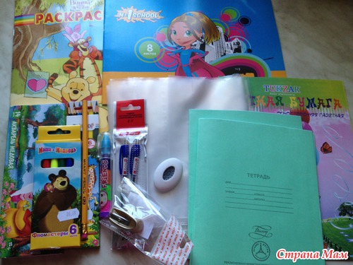 Альбомчик, раскраска, цв. бумага, тетрадочки, обложки(они всегда нужны, постоянно куда-то деваются)