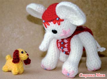 СЛОН МОСЬКА - Высота слонёнка, которого вы видите на фотографии, около 15 см. Для его изготовления понадобятся примерно 50 граммов белой, а также остатки красной и розовой пряжи, крючок диаметром в полтора раза толще используемой пряжи, синтепон для набивки игрушки, два отрезка толстой алюминиевой проволоки длиной около 20 см, штопальная игла и две чёрные пуговки для глаз.