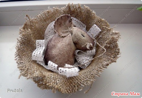 Ну а теперь пришиваем хвостик, чёрной ниточкой стежком делаем глазки, усики тоже из вытянутых нитей мешковины