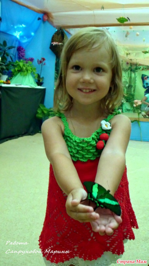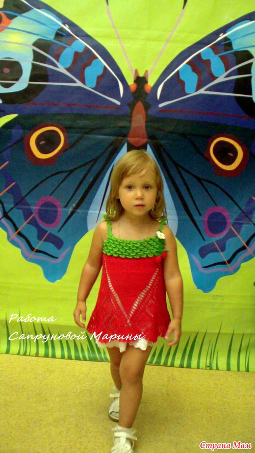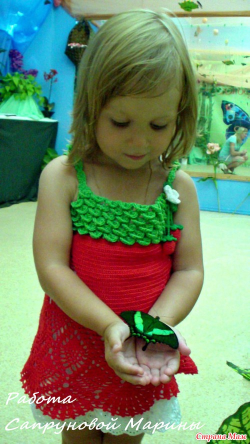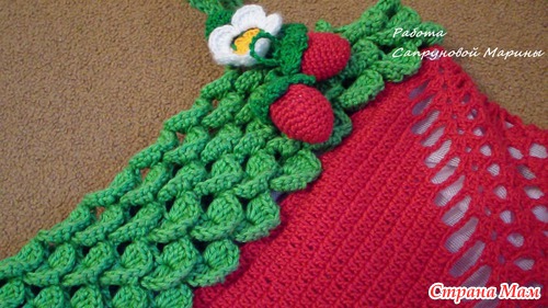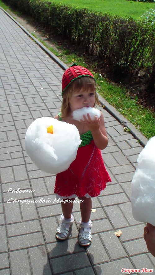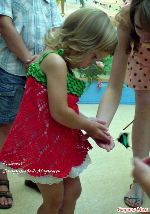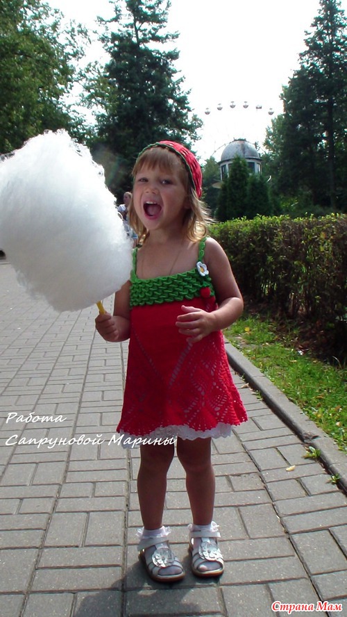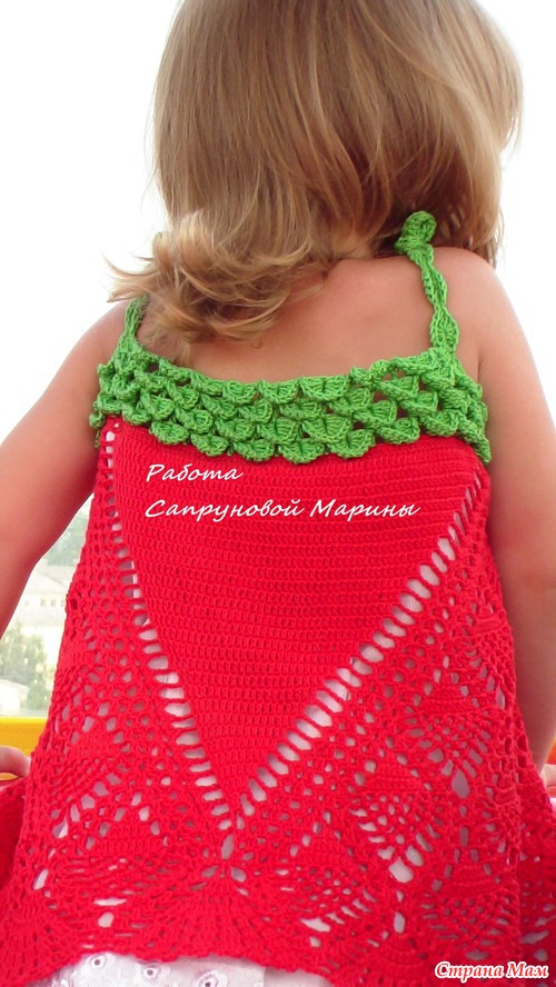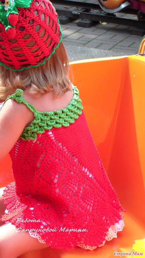 Вот этот топик. например, - увидела на просторах интернета (автор мiss1512 - http://club.osinka.ru/picture-7924540?p=12498067 - здесь же автор дает описание и схемы) и захотелось чего-то сочно-клубничного!!! Но т. к. лето подходит к концу и доча еще не выросла из первого ягодного топа (https://www.stranamam.ru/post/1528666/), а я человек чуть-чуть практичный - решила я связать топик для дочки на следующее лето (т. е. навырост)... и связала... и так он понравился дочери, а тут и погода просто шепчет - вообщем решили носить топ в этом году, как платье