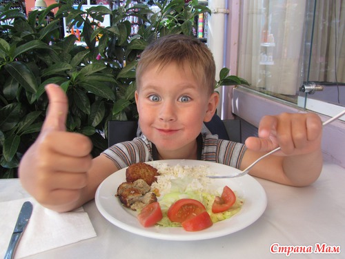 В половине первого идем к отелю. Рядом с отелем расположен небольшой ресторанчик BLAU – русский, мы здесь обедаем. Очень вкусно, и недорого. Даже сын с удовольствием съедает все, что ему принесли – вытребовал таки себе просто рис, 2 котлетки и довеском салатик… У нас – по большой тарелке пюре, салата из свежих овощей и курицы и меня и мяса с грибами у мамы…