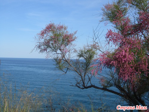 Полюбовавшись на него и на морские виды, открывающиеся уже с этой высоты скал – идем дальше, до деревянного моста через трассу. По скалам буйно цветут кактусы, разные кусты, необыкновенные деревья с красными метелками, напоминающие наши белые облачка скумпии… Оборачиваемся обратно – перед нами вся Калея… пляж… море… солнечный свет….