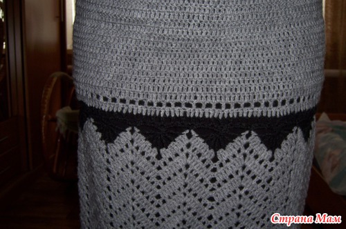 Юбку вязала снизу вверх, уменьшая номер крючка, по схеме от пуловера https://www.stranamam.ru/post/4769867/. Затем просто столбиками с накидом поворотными рядами, а пояс столбиками без накида, ввязывая тонкую резиночку.